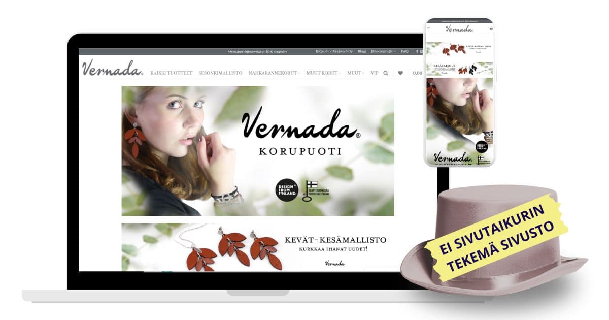 Vernadan verkkokauppa on alun perin toisen yrityksen rakentama, mutta jonkin verran siellä on nähtävillä myös minun kädenjälkeäni. Muokkasin Annen suunnitelman perusteella etusivun sekä tuotesivujen pohjan modernimmaksi ja olen asentanut myös jälleenmyyjille tarkoitetun tukkukaupan asetuksineen. Olen ollut Annelle teknisenä tukena aina tarvittaessa.