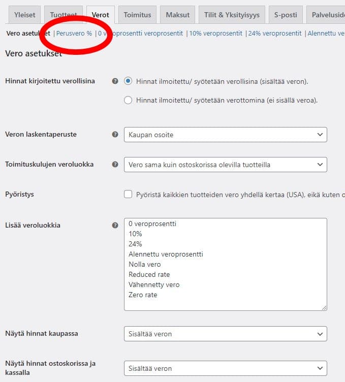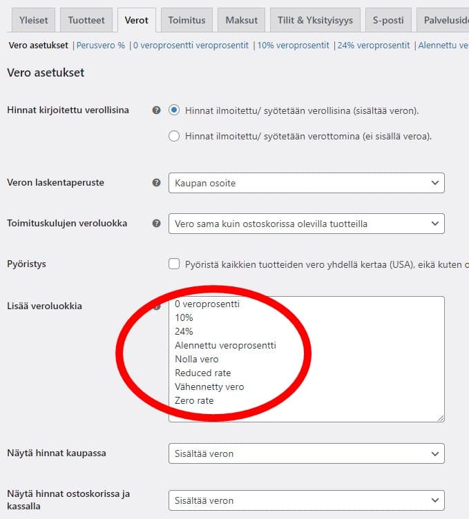 Toimituskulut on syötetty WooCommercen asetuksiin aina verottomana. Tämä tarkoittaa sitä, että kun veroprosenttia muokataan veroasetuksista, laskevat verolliset toimituskulut automaattisesti 0,45 %.