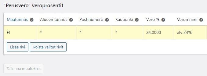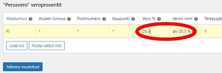 Klikkaa sarakkeessa ”Vero %” olevaa lukua ja vaihda se vastaamaan uutta veroprosenttia. Klikkaa sitten sarakkeessa ”Veron nimi” olevaa tekstiä ja muuta se vastaamaan uuden verokannan tietoa. Klikkaa lopuksi ”Tallenna muutokset” -painiketta. Jos painike ei ole aktiivinen, klikkaa ensin minne tahansa muualle sarakkeen alueella.