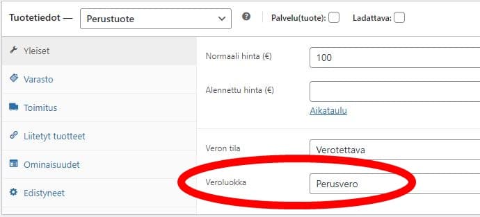 Joskus veroluokkia on listassa monta johtuen esim. lisäosien asetuksista tai verkkokaupan tekijän valinnoista. Käytössä olevan veroluokan voi päätellä tutkimalla tuotekorttia. Siellä tuotetiedot-ruudussa näkyy oletusvero.