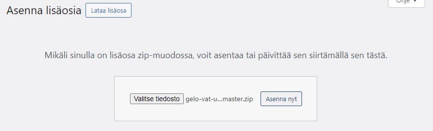 Mene sitten kaupan hallintaan lisäosien asennussivulle ja klikkaa Lataa lisäosa -painiketta. Valitse lataamasi gelo-vat-update.zip -tiedosto koneeltasi ja klikkaa Asenna nyt. Aktivoi lisäosa asentamisen jälkeen.